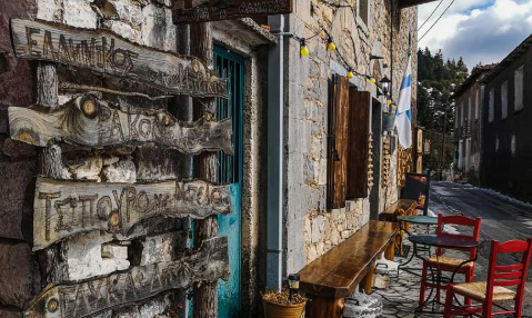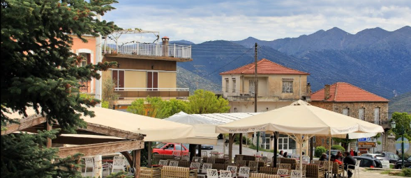 Le village de Lévidi est notre destination finale, ce jour là. Nous quittons Skotini en remontant en voiture pour regagner la route départmentale 66. Nous montons en très haute altitude parmi les forêts de sapin. Le vent devient violent alors nous arrêtons de prendre des photos. Nous descendons maintenant vers une plaine où on distingue le village de Kandila. Νous tournons sur notre droite et nous le traversons mais nous ne voyons rien d’étonnant qui puisse interrompre notre trajet. Nous reprenons la route vers Lévidi. Sur le trajet de Kandila à Lévidi, nous voyons la direction “Orchomène antique” dont parlait Homère alors nous allons visiter. Malheureureusement, le petit théâtre restant dont nous distinguons les estrades est abandonné. Vraiment dommage. C’est en reprenant notre route que nous voyons, perché sur un rocher au-dessus de Kandila, le tout blanc monastère de Kandila. Nous ne décidons pas d’aller le voir malgré notre curiosité et nous continuons notre route vers Lévidi. Lévidi contruit en amphithéâtre se trouve désormais dans le département d’Arcadia. C’est un grand village pivot pous aller dans les villages touristiques d’Arcadie comme Vytina par exemple. Nous nous promenons dans ces jolies ruelles bordées de vieilles maisons en pierre et nous nous reposons ensuite sur la place du village (photos plus haut). Nous déjeunons dans une des trois tavernes-restaurants avec vue sur la montagne. La spécialité du coin, c’est le petit cochon grillé sur la braise…