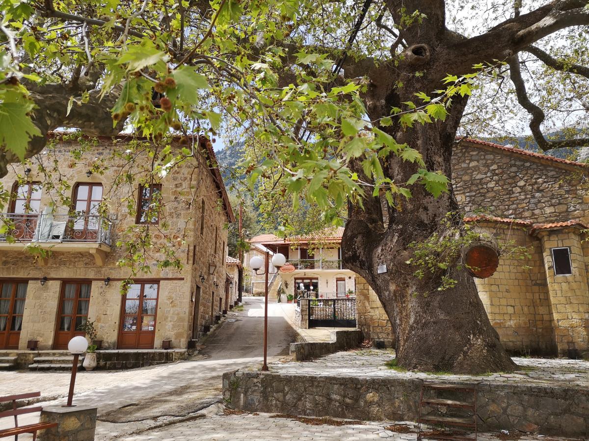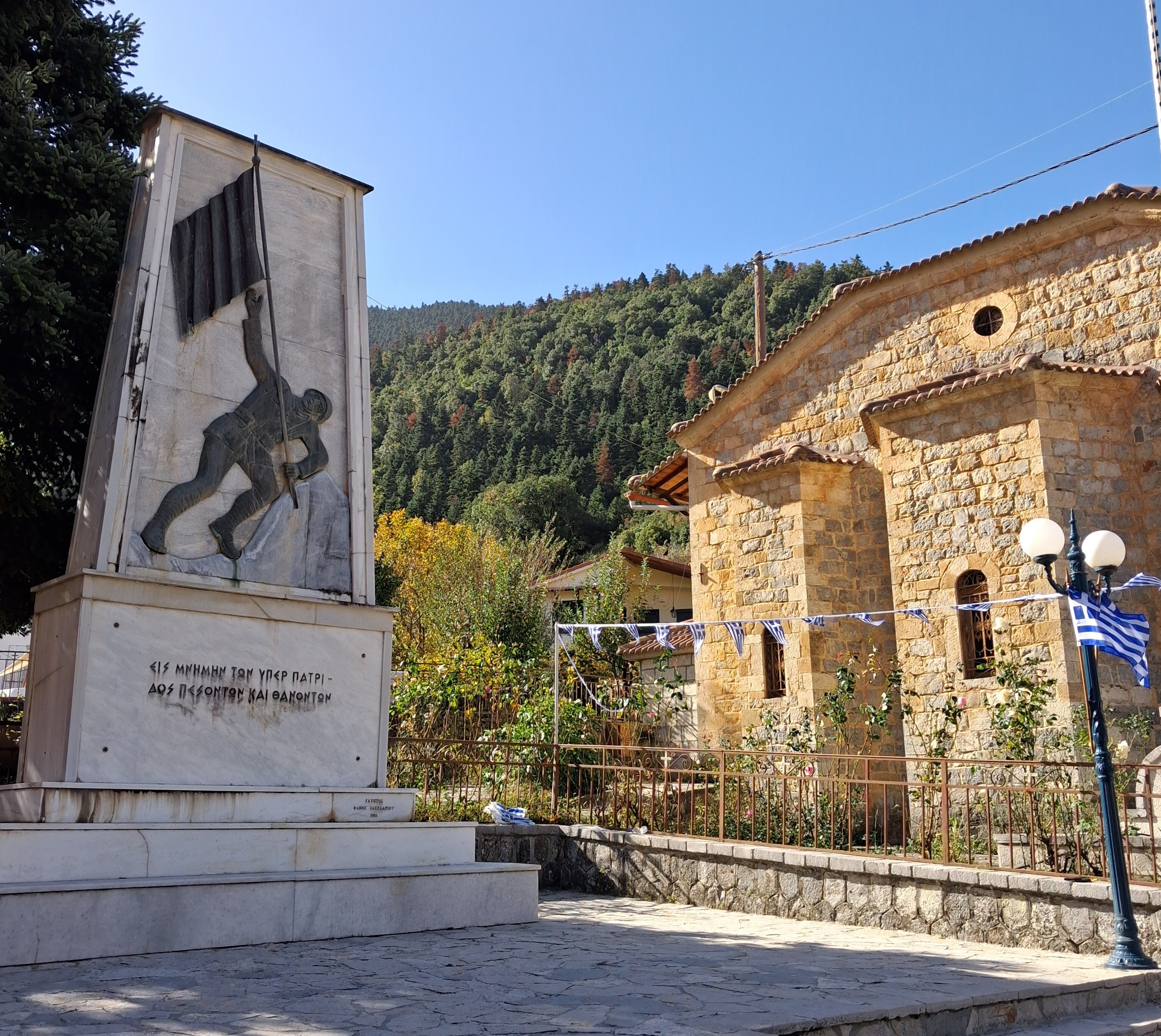 Le village de Kéfalari se trouve à 7 minutes de notre location à 800m d’altitude sur un des doux versants du Μont Ziria (photo plus haut à gauche). Nous allons le visiter un jour. Il est mignon comme tout avec sa toute petite place pittoresque, sous l’ombre d’un platane centenaire. À côté, il y a la sobre église de Saint Dimitrios et une belle maison d’hôtes traditionnelle appelée Archontiko Kefalari où on peut déjeuner ou dîner. Αu bout de la place, il y a une fontaine en pierre dont l’eau cristalline coule depuis des siècles. Elle est bien illuminée le soir. Il y a un café sympa sur la place et nous décidons d’y passer notre midi.