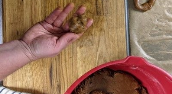 Préparation : Dans un grand bol, versez le moût, l’huile d’olive, le sucre, la cannelle et le clou de girofle. Le sucre doit avoir bien fondu. Dissolvez le bicarbonate de soude dans le cognac et ajoutez-le au tout. Mélangez avec le fouet de cuisine jusqu’à ce que les ingrédients soient bien homogènes. Tamisez la farine avec la levure et ajoutez cette poudre progressivement au mélange tout en pétrissant, jusqu’à ce que vous obteniez une pâte molle et douce ne collant plus aux mains. Si elle colle, ajoutez encore de la farine. La pâte doit rester assez grasse mais ferme afin de pouvoir être façonnée. Laissez-la ensuite se reposer pendant un quart d’heure.