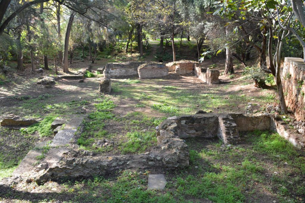1. Le gymnase. Dans le grand jardin de l’Académie de Platon, entre l’entrée principale (rue Kratylou et Tripoleos) et l’église de Saint Tryphon, une partie du gymnase a été révélée. On peut voir des éléments de la grande cour rectangulaire avec sa Palaestra. Au nord, un réservoir donnait de l’eau à une salle de bains pour les athlètes. Ce bâtiment est daté du 1er siècle chrétien. Des fragments de bâtiments de l’époque romaine ont également été trouvés des deux côtés, liés sans aucun doute aux fonctions sportives et éducatives de cet espace.