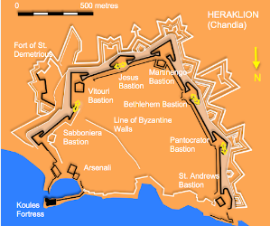 Le gigantesque château de Chandakas s’allongeait le long de la mer sur plusieurs kilomètres et possédait 7 bastions et des forteresses extérieures qui communiquaient avec les murs par des passages souterrains. Candie restait une des dernières forteresses non influencées depuis 1650 par la propagande ottomane. Le château avec ses réfugiés avait hissé un drapeau avec une énorme croix en son sommet. Morosini voyait les forces militaires vénitiennes s’affaiblir et l’aide des Francs complètement désordonnée. Chandakas ou Héraklion n’avait plus de forces humaines surtout pour sa défense alors Morosini décide, sans avoir reçu l’autorisation de Venise, de capituler et de livrer la ville aux Turcs Ottomans en 1669.
